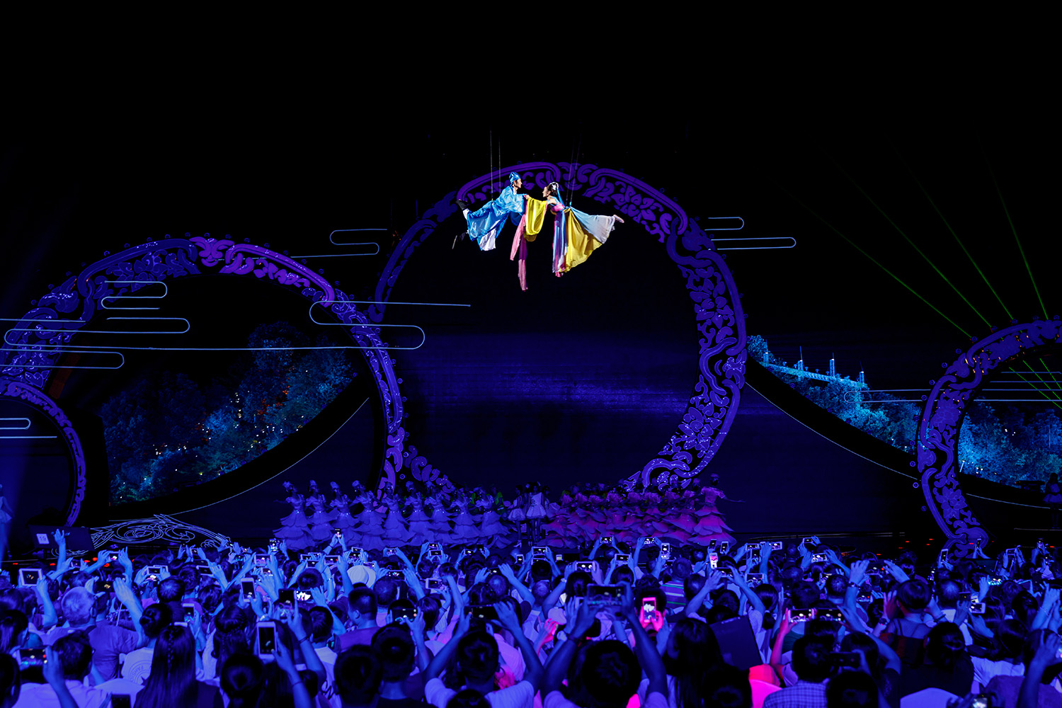 在歌手徐千雅演唱《仙女湖》的同時,現場放飛了108只夏布繡喜鵲,并伴隨著特地為此次七夕晚會設計的仙氣飄飄的夏布長裙,在仙女湖畔吹起一陣靈動之風。這是此次節目中,將傳統文化元素與舞臺藝術完美結合的一大亮點,也是史上首次將夏布繡運用于夏布服裝的裝飾之上。夏布繡是國家非物質文化遺產。早在農耕時代,婦女們在田間勞作間隙聚集在一起,互相交流學習,傳授技藝經驗,因此出現了夏布繡,人們通過刺繡的內容來具體表達美好的祝愿和祝福。為了在晚會中充分展示夏布繡的獨特魅力,節目組與非遺傳承人張小紅老師合作,利用節目籌備的5天時間,發動張老師整個繡坊的繡娘,制作了108只夏布繡喜鵲,在現場放飛,這將會成為牛郎和織女的一次難忘相遇。同時,在李玉剛的《剛好遇見你》節目中,節目組將最新的現代舞臺技術搬到現場,制作出8米寬的夏布紡織機,與高達10米的雨絲幕相結合,投影出浪漫唯美的荷塘小景,意境悠揚。