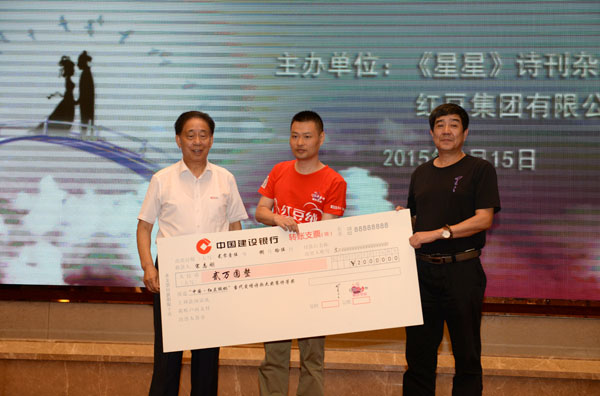 為了進一步繁榮愛情詩創(chuàng)作,弘揚正確愛情觀,特別是推動中國當(dāng)代愛情詩再度輝煌,2014年7月1日,由《星星》詩刊雜志社與紅豆集團聯(lián)合啟動了“中國?紅豆絨杯”當(dāng)代愛情詩大獎賽征文活動,作為紅豆七夕節(jié)的一項重要活動。現(xiàn)在經(jīng)過一年的征集及后期評選,在今年七夕——中國情人節(jié)前夕頒獎。