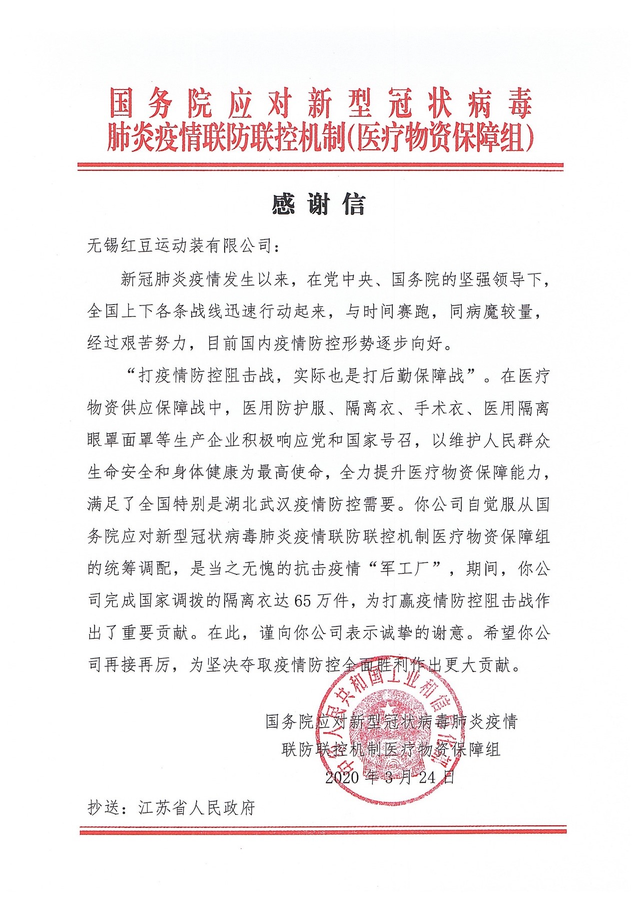 因為紅豆在抗擊疫情中作出的貢獻,國務院應對新型冠狀病毒肺炎疫情聯防聯控機制(醫療物資保障組)給紅豆發來感謝信,稱贊紅豆為抗擊疫情當之無愧的“軍工廠”。9月8日,在全國抗擊新冠肺炎疫情表彰大會上,周海江榮獲 “全國抗擊新冠肺炎疫情先進個人”“全國優秀共產黨員”兩項殊榮,是同時獲得兩項殊榮的唯一民營企業家。