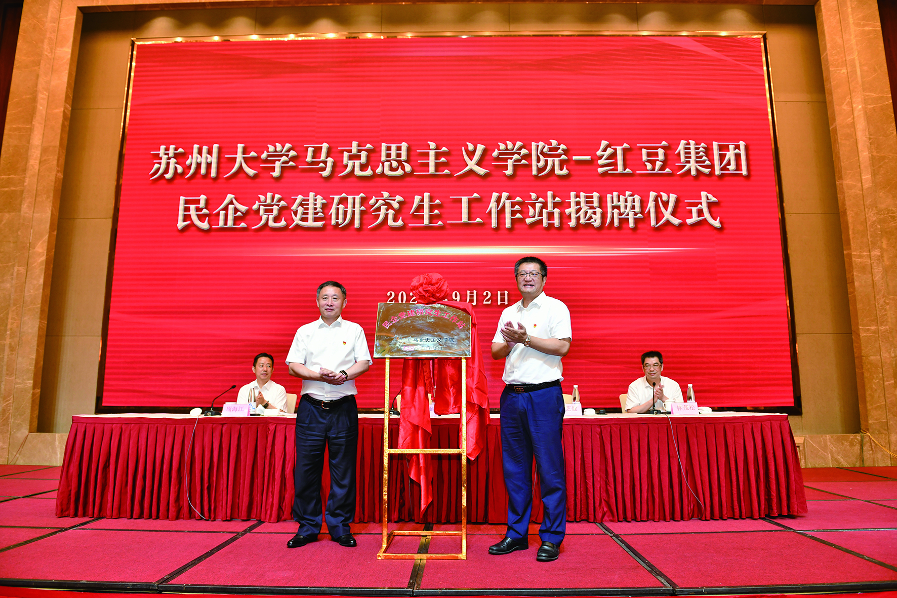 9月2日,無(wú)錫市“兩新”組織黨組織書記示范培訓(xùn)班在紅豆集團(tuán)開班。開班式上,蘇州大學(xué)馬克思主義學(xué)院—紅豆集團(tuán)民企黨建研究生工作站揭牌成立,無(wú)錫市委常委、組織部部長(zhǎng)柏長(zhǎng)嶺和蘇州大學(xué)馬克思主義學(xué)院院長(zhǎng)田芝健共同揭牌。